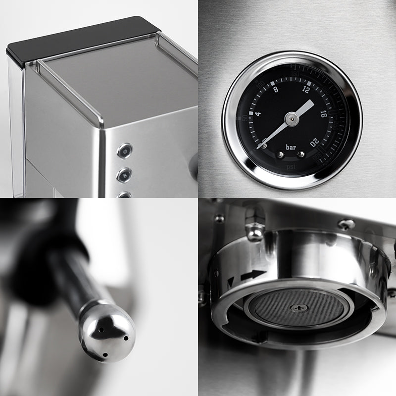 - Componentes de Grado Comercial: Incluye un portafiltro comercial de acero inoxidable de 58 mm y una punta de varilla de vapor de tres orificios diseñada para mejorar el rendimiento y facilitar la creación de microespuma sedosa para lattes y capuchinos.